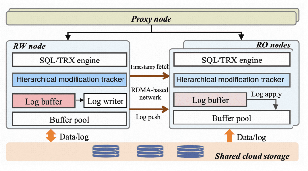 PolarDB-SCC采用了基于共享存储的一写多读架构,包含一个读写(RW)节点和多个只读(RO)节点。RW和RO节点可以进一步连接到代理节点上。代理节点可通过将读请求分发到RO节点并将写请求转发到RW节点来实现读写分离,从而提供透明的负载平衡。RW节点和RO节点通过基于RDMA的网络连接,可快速传输日志和获取时间戳。