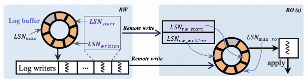 具体实现如下图所示,RO和RW都维护了相同大小的log buffer。RW的后台线程会将RW的log buffer通过RDMA写入到RO的log buffer。由于RO的CPU并不参与日志的传输,所以RO是无法感知其缓存内哪些日志是有有效的,而RW也无法感知RO上哪些日志已经回放完了。所以日志传输协议需要一些额外的控制信息来保证不会出现覆盖的情况。由于篇幅限制,具体细节这里就不具体展开了,可以参考论文。