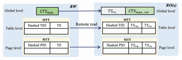 RW上三个层次的时间戳都是放在内存哈希表中的,为了减少这部分的内存使用量,会存在多个表或page的时间戳放到同一个位置,但是只允许大的时间戳替换小的时间戳,这样,即使RO拿到一个大的时间戳也不影响一致性。具体设计如下图所示,TID和PID分别表示表和page的ID。RO拿到对应的时间戳都会按照前面提到的线性Lamport时间戳的设计将其缓存到本地,可以给其他符合条件的请求使用。