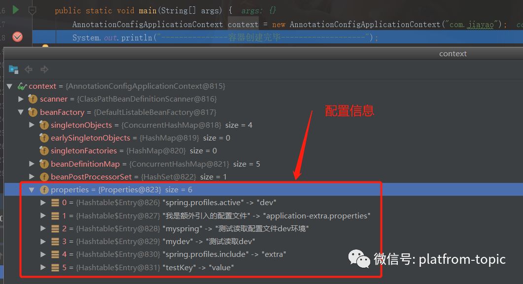 用于在类的扫描器ClassPathBeanDefinitionScanner中将扫描出来的配置文件信息注册到BeanFactory中,并且提供对外查询接口,获取配置文件信息;(回头可优化添加@Value注解,实现属性注入),完成上述操作后,我们在IOC项目中启动程序,通过断点查看一下读取到的配置文件是否是我们上门所配置的配置信息