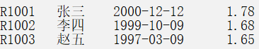 import java.sql.*;public class Example1 {public static void main(String[] args) {System.out.println();Connection con = null;Statement sql;ResultSet rs;try {Class.forName("com.mysql.jdbc.Driver"); //加载JDBC-MySQL驱动}catch (Exception e) {}String uri = "jdbc:mysql://localhost:3306/students?useSSL=true";String user = "root";String password = "";try {con = DriverManager.getConnection(uri, user, password); //连接代码}catch (SQLException e) {}try {sql = con.createStatement();rs=sql.executeQuery("SELECT * FROM mess"); //查询mess表while(rs.next()) {String number = rs.getString(1);String name = rs.getString(2);Date date = rs.getDate(3);float height = rs.getFloat(4);System.out.printf("%s\t",number);System.out.printf("%s\t",name);System.out.printf("%s\t",date);System.out.printf("%.2f\n",height);}con.close(); //关闭连接}catch(SQLException e) {System.out.println(e);}}}
