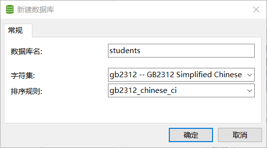 在主界面上选择一个连接,例如MySQL,右击,选择“打开连接”命令,以便通过该连接在MySQL数据库服务器中建立数据库。打开MySQL连接后,在MySQL上右击,然后选择“新建数据库”命令,在弹出的“新建数据库”对话框中输入、选择有关信息,例如输入数据库的名称,选择使用的字符编码。这里建立的数据库的名字是students,选择的字符编码是gb2312(GB2312 Simplified Chinese),如下图所示。