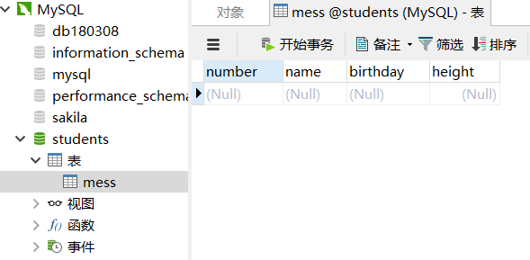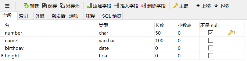 在主界面上,右击MySQL连接下的数据库students,选择“打开数据库”命令,主界面上的students数据库将呈现打开(连接)状态(如上图所示),然后右击students下的“表”选项,选择“新建表”命令,弹出“新建表”对话框(单击对话框上的添加栏位可以添加字段,即添加表中的列名),在该对话框中输入表的字段名(列名)与数据类型(如下图所示),其中number字段是主键,即要求记录的number的值必须互不相同。将该表保存为名字是mess的表。这时,数据库students的“表”下将有名字是mess的表(如上图所示)。