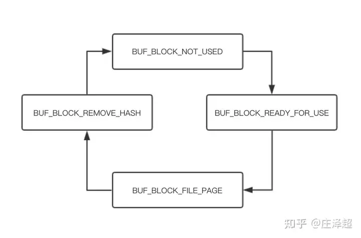 BUF_BLOCK_REMOVE_HASH //在Page从LRU List和Flush List中被回收并加入Free List时,需要先从 Page_hash中移除,此时Page处于这个状态