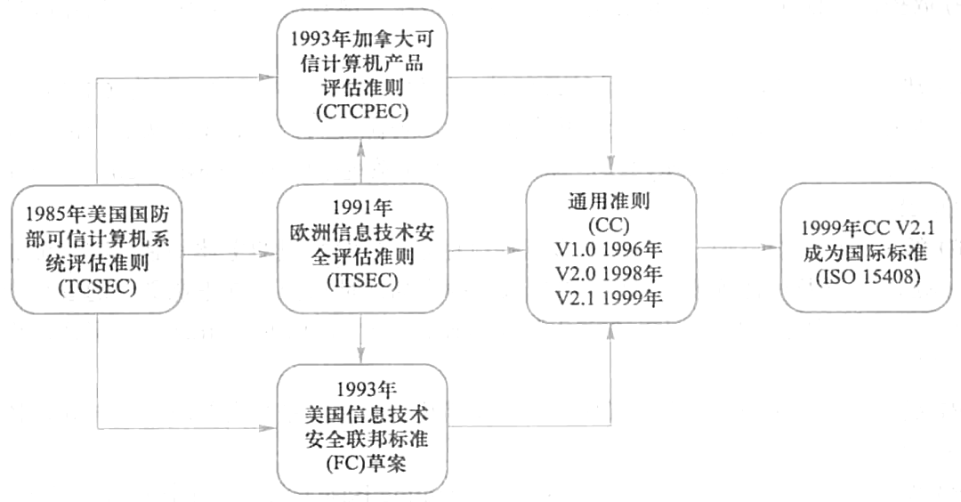 计算机以及信息安全技术方面有一系列的安全标准,最有影响的当推TCSEC和CC这两个标准。发展历史如下图所示:
