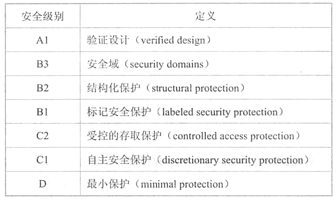 TCSEC/TDI将系统划分为4组(division)7个等级,依次是D、C(C1,C2)、B(B1,B2,B3)、A(A1),按系统可靠或可信程度逐渐增高,如下表所示:
