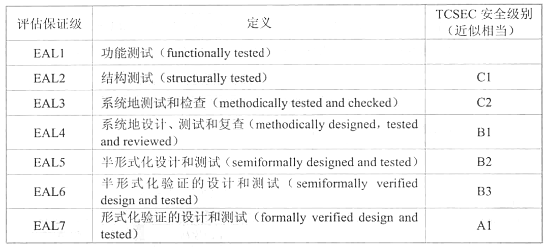 粗略而言,TCSEC的C1和C2级分别相当于EAL2和EAL3;B1、B2和B3分别相当于EAL4、EAL5和EAL6;A1对应于EAL7。