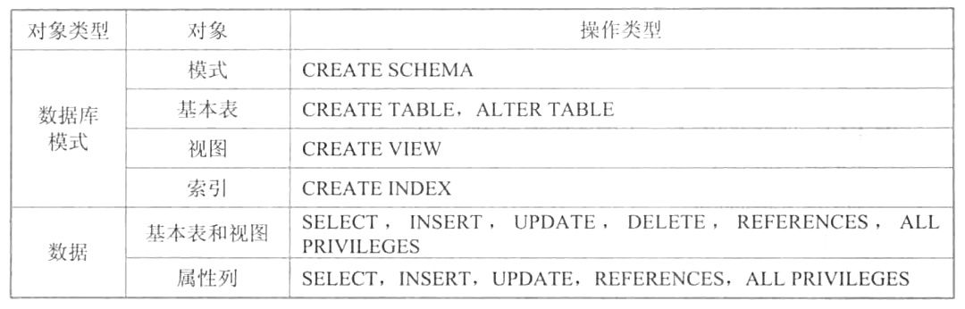 存取控制的对象不仅有数据本身(基本表中的数据、属性列上的数据),还有数据库模式(包括数据库、基本表、视图和索引的创建等),下表列出了主要的存取权限。