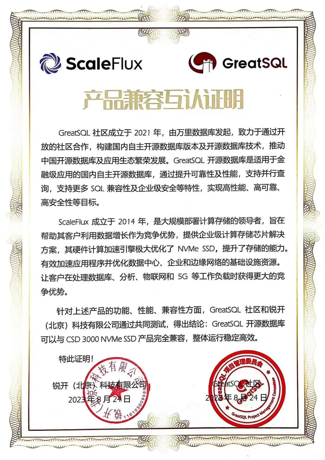 本次GreatSQL与ScaleFlux开源数据库进行了全方位的测试验证,测试结果表明,相比普通NVMe SSD,GreatSQL数据库搭载CSD 3000后,不仅性能实现大幅提升,从而解决数据库的高效访问、方便共享等问题,还可以降低存储成本,为企业达到降本增效的目的。