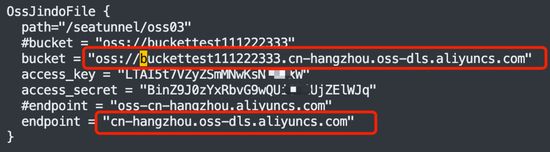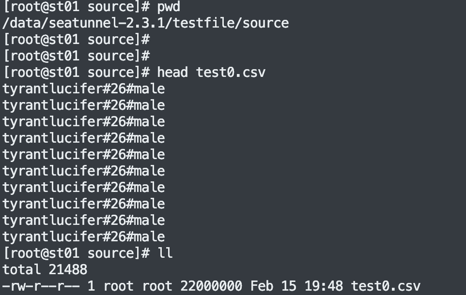 env {# You can set SeaTunnel environment configuration hereexecution.parallelism = 10job.mode = "BATCH"checkpoint.interval = 10000#execution.checkpoint.interval = 10000#execution.checkpoint.data-uri = "hdfs://localhost:9000/checkpoint"}source {LocalFile {#本地待同步的数据文件夹, 本例子中只有一个 test0.csv 文件,具体内容参考下图path = "/data/seatunnel-2.3.3/testfile/source"type = "csv"delimiter = "#"schema {fields {name = stringage = intgender = string}}}}sink {OssJindoFile {path="/seatunnel/oss03"bucket = "oss://bucket123456654321234.cn-hangzhou.oss-dls.aliyuncs.com"access_key = "I5**********W"access_secret = "Bi***********TA"endpoint = "cn-hangzhou.oss-dls.aliyuncs.com"}}