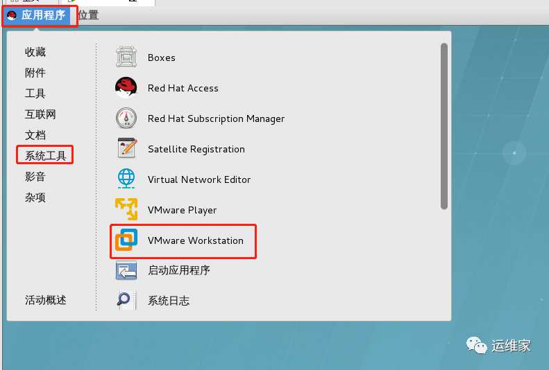 点击左上角的 “应用程序” -- “系统工具” -- “VMware Workstation”