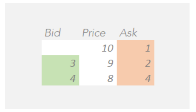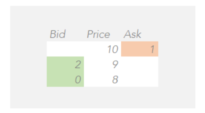 以下是一个在连续(非竞拍)交易中的订单簿的简单示例。我们可以看到,在价格水平为9的地方,有2股的买盘,这意味着市场参与者愿意以9的价格购买2股。类似地,我们可以看到在价格水平为10的地方,有1股的卖盘,这意味着市场参与者愿意以10的价格出售1股。