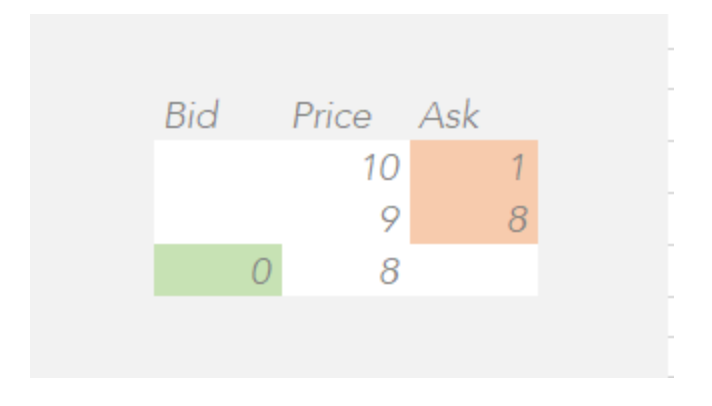 对于这种连续交易的订单簿,最高的买盘价格始终会低于最低的卖盘价格。例如,如果有人以价格为9的价格提交了10股的卖盘,那么将会匹配2股,因为有人愿意以9的价格购买2股。新的最佳卖盘将是以价格9的8股,订单簿的新状态如下所示。