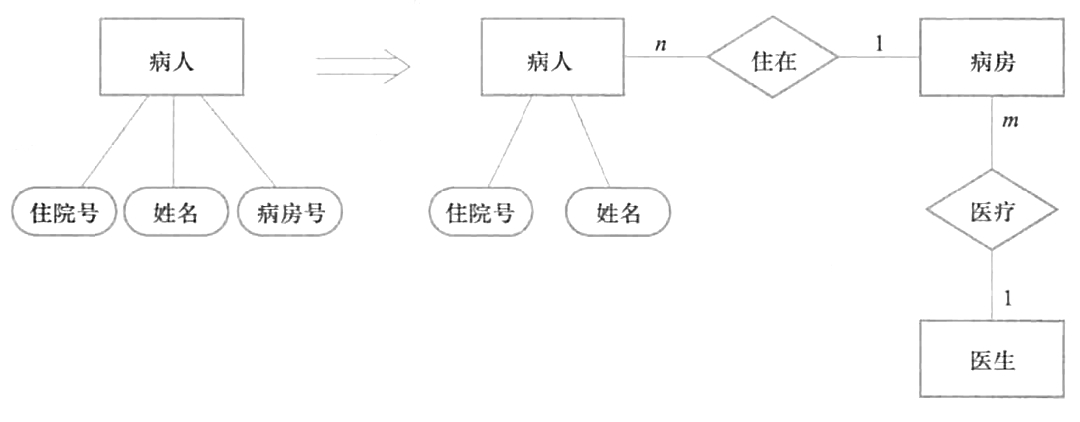 又如,在医院中一个病人只能住在一个病房,病房号可以作为病人实体的一个属性;但如果病房还要与医生实体发生联系,即一个医生负责几个病房的病人的医疗工作,则根据准则(2)病房应作为一个实体,如下图所示。