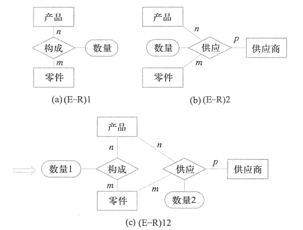 例如,下图(a)中零件与产品之间存在多对多的联系“构成”,图(b)中产品、零件与供应商三者之间还存在多对多的联系“供应”,这两个联系互相不能包含,则在合并两个E-R图时就应把它们综合起来(图(c))。
