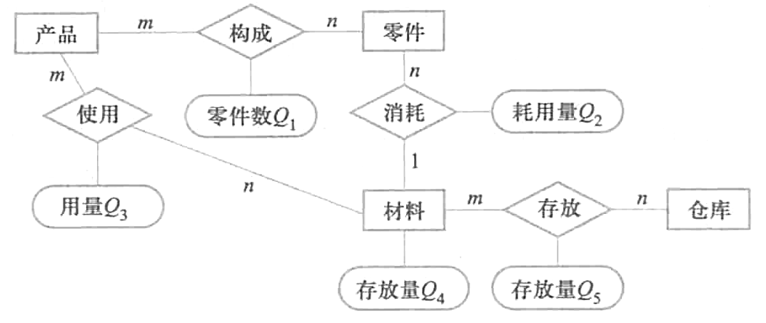 消除冗余主要采用分析方法,即以数据字典和数据流图为依据,根据数据字典中关于数据项之间逻辑关系的说明来消除冗余。如下图中Q3=Q1×Q2,Q4=∑Q5,所以Q3和Q4是冗余数据,可以消去;并且由于Q3消去,产品与材料间m:n的冗余联系也应消去。