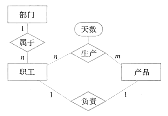 职工和产品之间多对多的联系可表示为(职工号,产品号)→工作天数等。