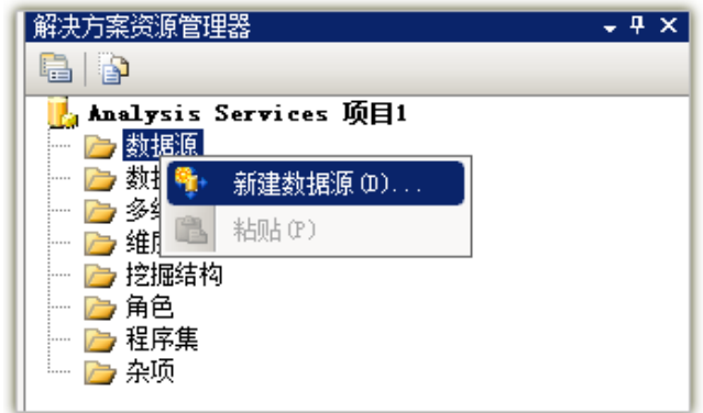 在解决方案管理器的“Analysis Services 项目 1”节点的“数据源” 节点位置建立新建 GBase 数据源。