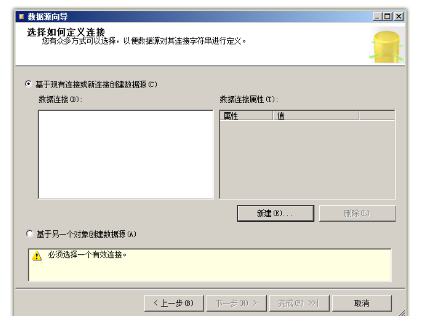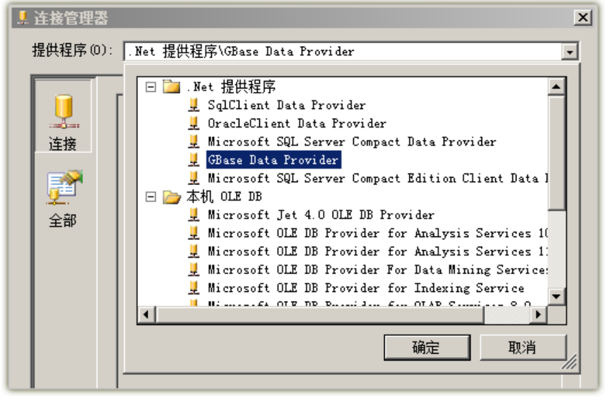 在数据源向导中新建数据连接,在提供程序下拉列表中的.NET 提供程 序中选择“GBase Data Provider”,在出现的视图界面中输入正确信 息后点击确定后完成。并随着向导一步步操作,最后点击完成。在建 立 GBase 数据源后,一定要选中“Sql Server Mode”连接串选项。否 则会在“新建数据源视图”的最后一步点击确定时弹出错误对话框。