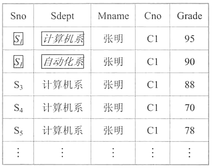 本节首先讨论一个关系属性间不同的依赖情况,讨论如何根据属性间依赖情况来判定关系是否具有某些不合适的性质,通常按属性间依赖情况来区分关系规范化程度为第一范式、第二范式、第三范式和第四范式等;然后直观地描述如何将具有不合适性质的关系转换为更合适的形式。上节关系模式Student<U,F>中有Sno→Sdept成立,也就是说在任何时刻Student的关系实例(即Student数据表)中,不可能存在两个元组在Sno上的值相等,而在Sdept上的值不等。因此,下表的Student表是错误的。因为表中有两个元组在Sno上都等于S1,而