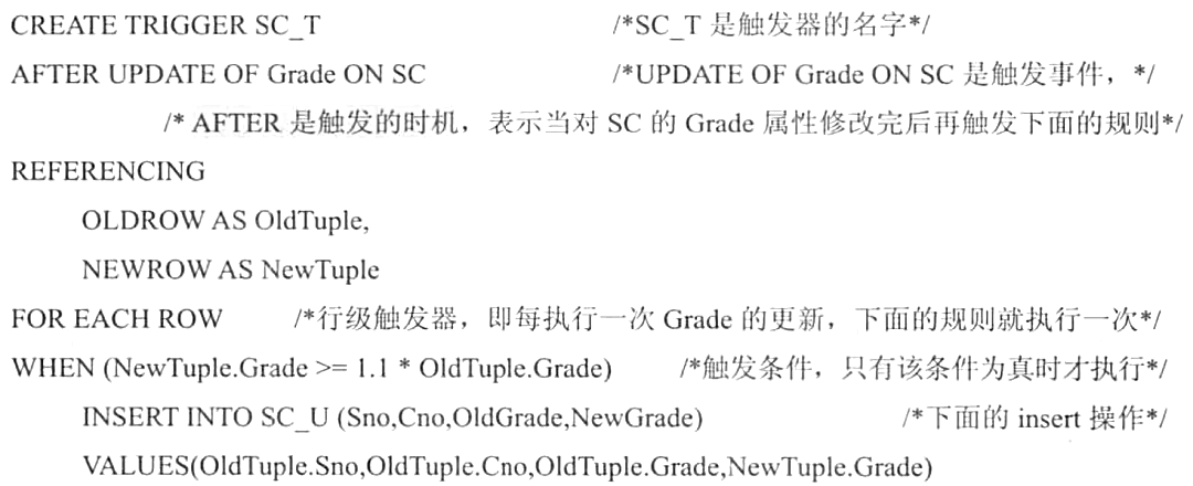 【例1】当对表SC的Grade属性进行修改时,若分数增加了10%,则将此次操作记录到另一个SC_U(Sno、Cno、Oldgrade、Newgrade)中,其中Oldgrade是修改前的分数,Newgrade是修改后的分数。