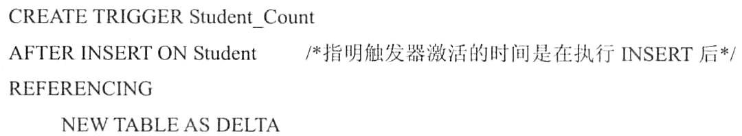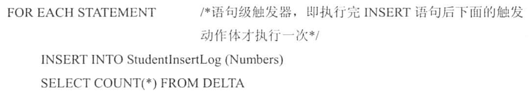 在本例中出现的FOR EACH STATEMENT,表示触发事件INSERT语句执行完成后才执行一次触发器中的动作,这种触发器叫做语句级触发器。而例1中的触发器是行级触发器。默认的触发器是语句级触发器。DELTA是一个关系名,其模式与 Student 相同,包含的元组是INSERT语句增加的元组。