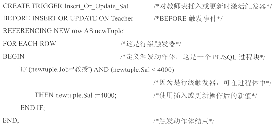 在本例中REFERENCING指出引用的变量,如果触发事件是UPDATE操作并且有FOR EACH ROW子句,则可以引用的变量有OLDROW和NEWROW,分别表示修改之前的元