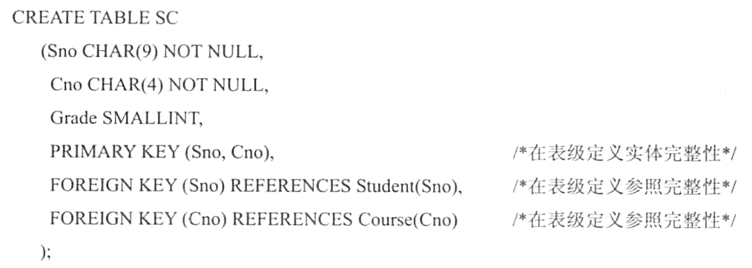 例如,学生表中“专业号”是外码,按照应用的实际情况可以取空值,表示这个学生的专业尚未确定。但在学生一选课数据库中,关系Student为被参照关系,其主码为Sno; SC为参照关系,Sno为外码,它能否取空值呢?答案是否定的。因为Sno为SC的主属性,按照实体完整性Sno不能为空值。若SC的Sno为空值,则表明尚不存在的某个学生,或者某个不知学号的学生,选修了某门课程,其成绩记录在Grade列中。这与学校的应用环境是不相符的,因此SC的Sno列不能取空值。同样,SC的Cno是外码,也是SC的主属