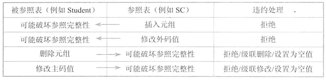 参照完整性将两个表中的相应元组联系起来了。因此,对被参照表和参照表进行增、删、改操作时有可能破坏参照完整性,必须进行检查以保证这两个表的相容性。