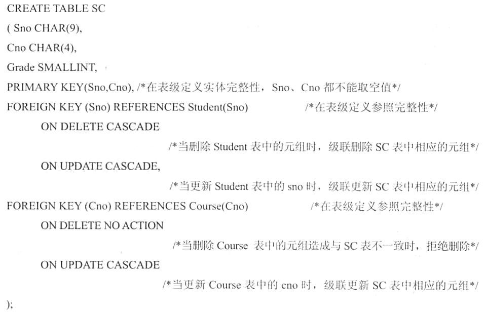 可以对DELETE和UPDATE采用不同的策略。例如,例2中当删除被参照表Course表中的元组,造成与参照表(SC表)不一致时,拒绝删除被参照表的元组;对更新操作则采取级联更新的策略。