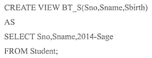 由于AS子句中SELECT语句的目标列平均成绩是通过作用聚集函数得到的,所以CREATE VIEW中必须明确定义组成S_G 视图的各个属性列名。S_G是一个分组视图。