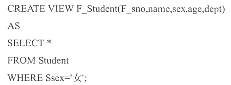 这里视图F_Student是由子查询“SELECT*”建立的。F_Student视图的属性列与Student表的属性列一一对应。如果以后修改了基本表Student的结构,则Student表与F_Student视图的映像关系就会被破坏,该视图就不能正常工作了。为避免出现这类问题,最好在修改基本表之后删除由该基本表导出的视图,然后重建这个视图。