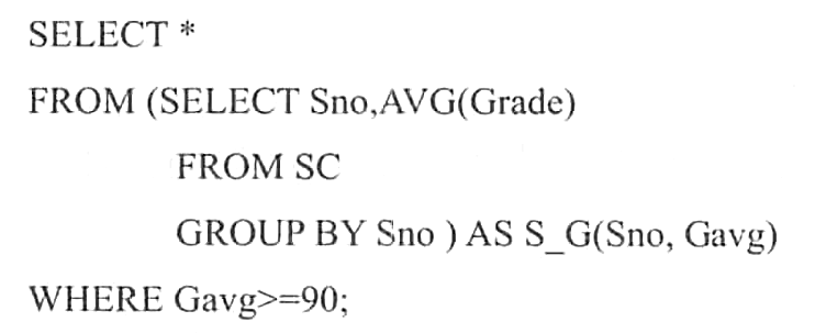 【例11】在S_G视图(例6中定义的视图)中查询平均成绩在90分以上的学生学号和平均成绩,语句为