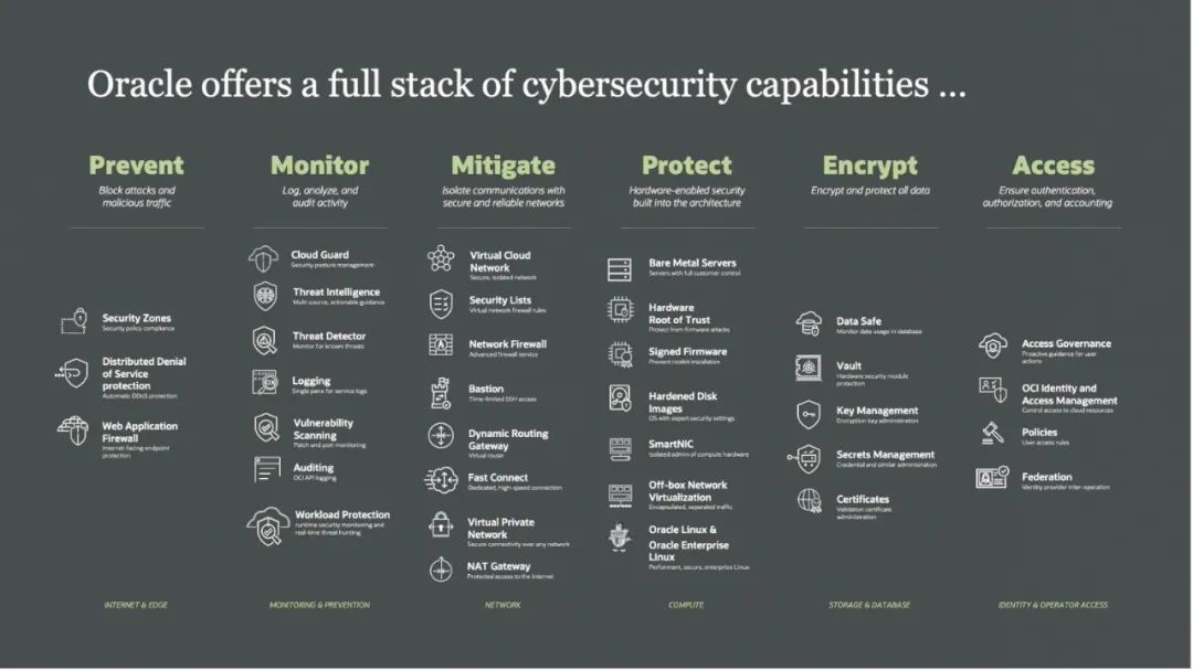 今天,OCI可以向用户提供全栈的网络安全能力。大部分列在了图中。当我们开始搭建我们的第二代公有云时,我们希望将安全置入并且作为所有我们提供的服务的基础。我们必须从根本上考虑我们的网络架构、网络安全和隔离,从一开始就确保您的工作负载是安全的。