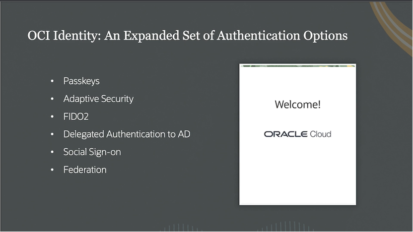 从身份的角度来看,Oracle在身份领域已经引领了一段时间。我们在平台中添加了许多新功能和集成。过去,密码是需要记忆的一件事,有了密钥,它可以让您成为您自己,云平台通过设置密钥可以帮助您抵御钓鱼和攻击。今天,Oracle将首先在我们自己的云中实现无密码化。