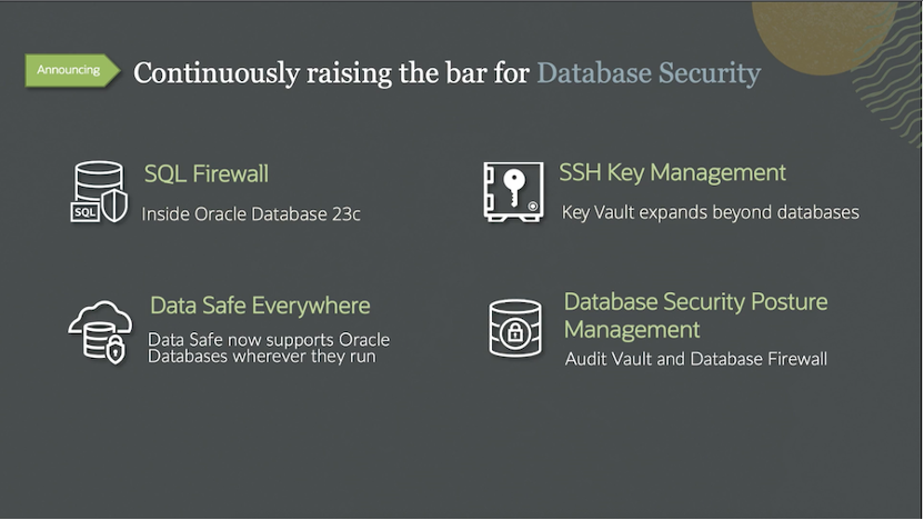Oracle是数据库领域的引领者,我们正在持续提升数据库的安全性,在Oracle数据库23C版本中,我们宣布了SQL Firewall等特性。他们将会帮助您防止凭据上的等值注入、打包和被盗数据库锁定。今天,我们支持通过数据安全特性来管理数据库,无论数据库部署在哪里,哪怕是在其他公有云、本地部署,数据安全都能随时随地保护您的数据。