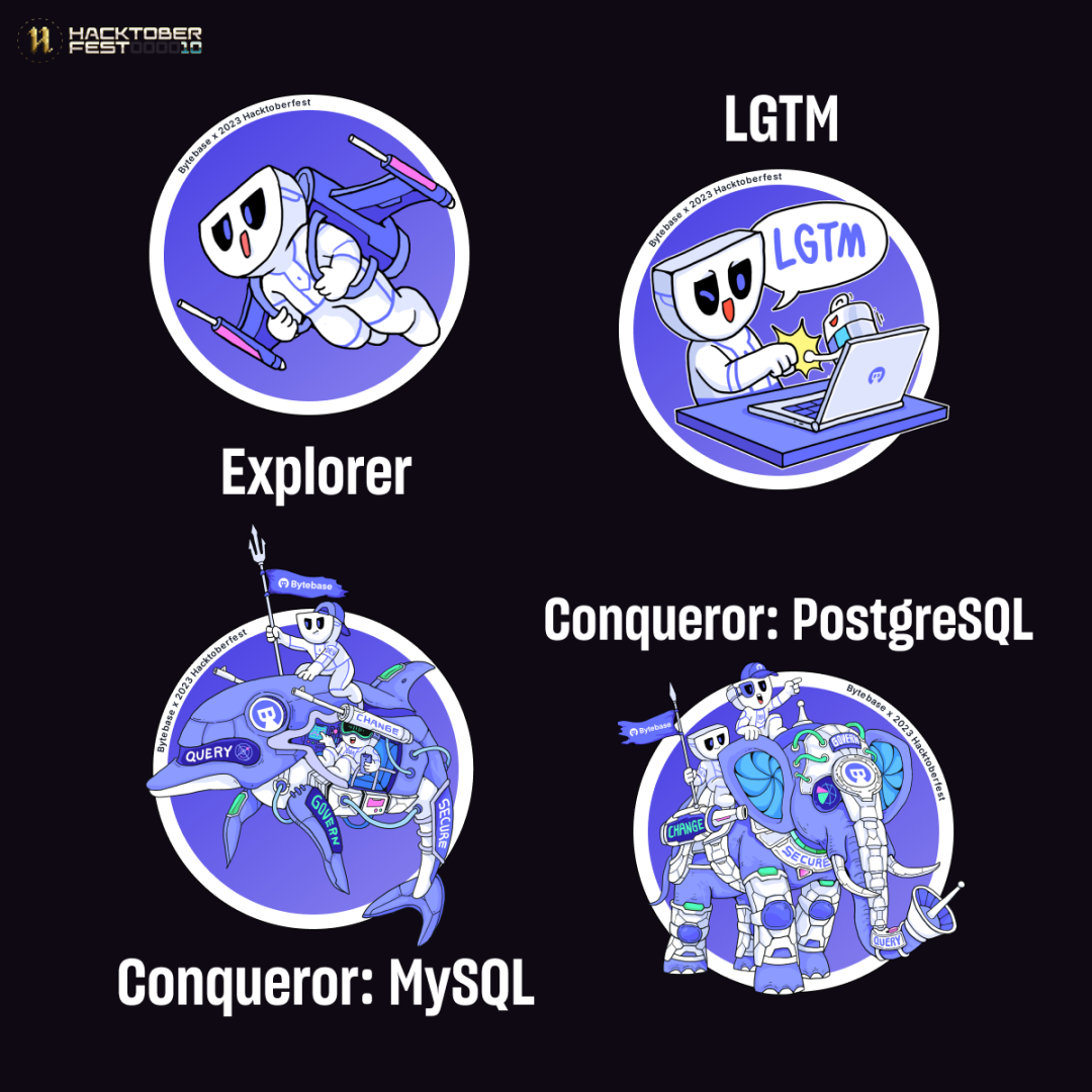 标签的 Issue 并被合并 (直达链接:https://github.com/bytebase/bytebase/issues?q=is%3Aissue+is%3Aopen+label%3Ahacktoberfest)Conqueror 徽章 - 共两款:PostgreSQL MySQL。发布一篇关于「使用 Bytebase 的 PostgreSQL MySQL 的 GitOps 实践」教程(中英文皆可),比如此优秀案例🏅️。