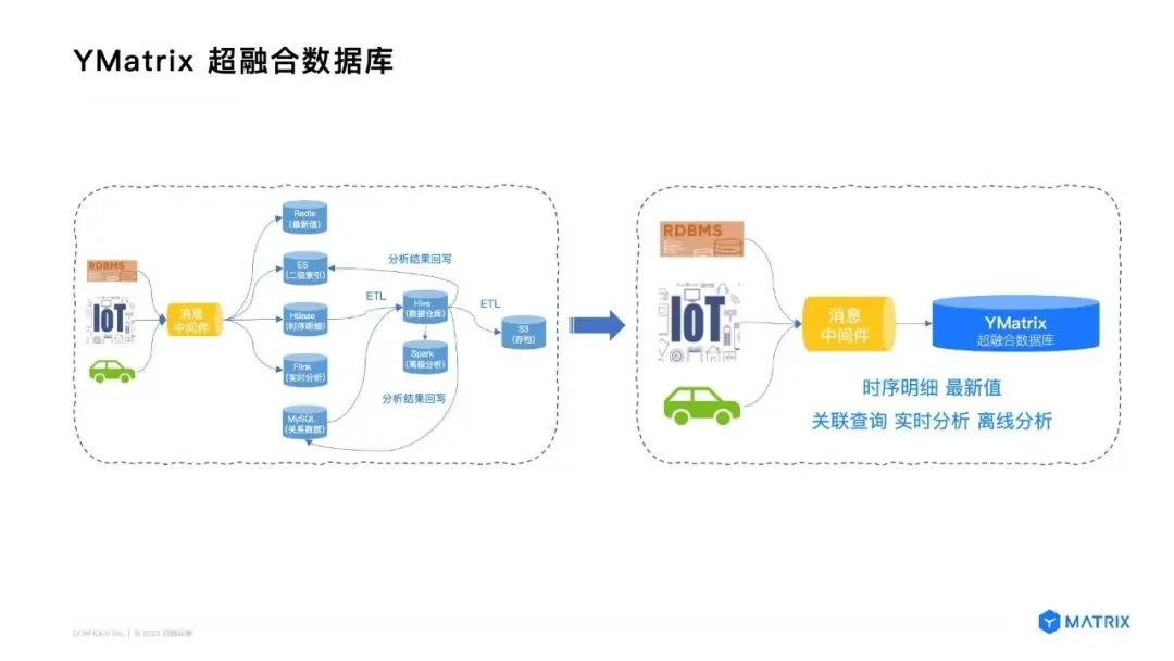 对比之前我们提到的多种组件拼装组合的架构方案,通过 YMatrix 超融合数据库,我们希望大幅简化整体的技术架构。我们的目标是基于多核数据库架构技术,把所有的操作及类型凝聚到一个数据库中。这样用户就可以面向这一个数据库进行操作、维护和更新,来实现包括时序明细分析、最新值、关联查询、实时分析、离线分析等等几乎所有的查询需求。