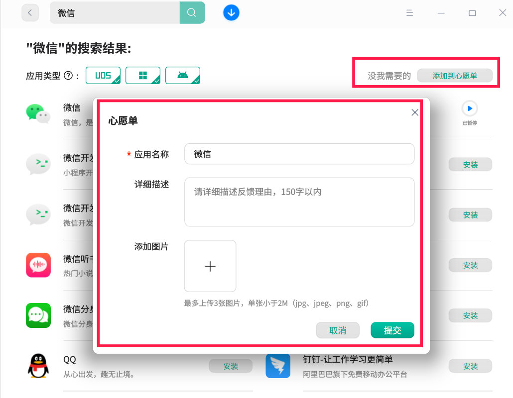 搜索结果页,新增心愿单功能,支持提交应用需求