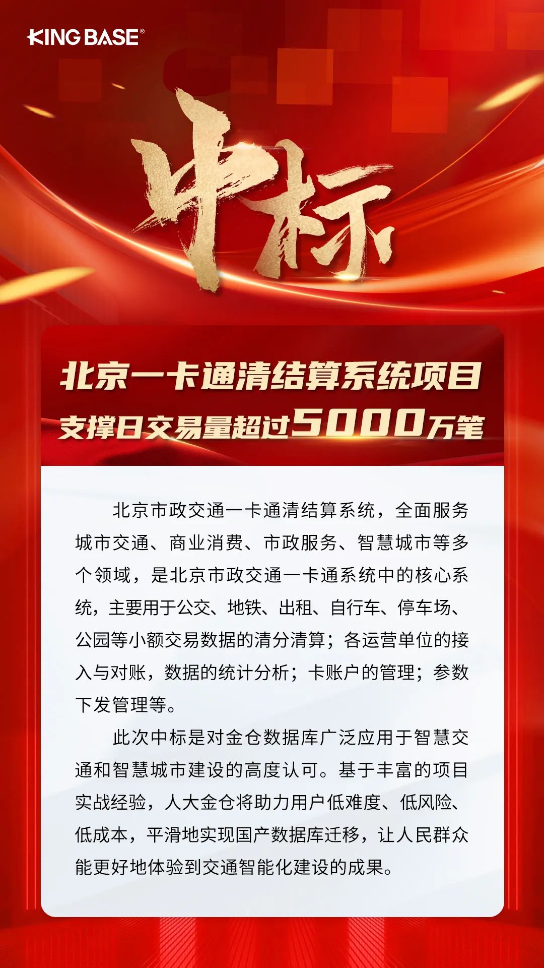 此次中标是对金仓数据库广泛应用于智慧交通和智慧城市建设的高度认可。基于丰富的项目实战经验,人大金仓将助力用户低难度、低风险、低成本,平滑地实现国产数据库迁移,让人民群众能更好地体验到交通智能化建设的成果