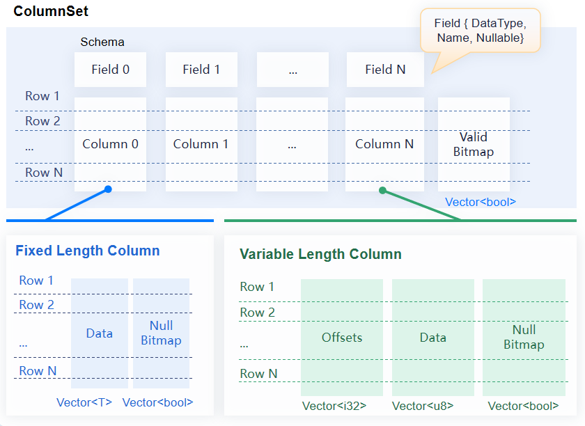 ColumnSet:我们将以列存的方式组织到一起的一批记录称为ColumnSet,它是一个二维的数据集,由许多相邻的向量组成,每个向量的记录数相同,不同向量之间按行逻辑对齐。与表类似,ColumnSet也有一个Schema,该模式必须匹配其向量的数据类型。ColumnSet是一个便于序列化和计算的工作单元,每个ColumnSet还有一个可选的位图用来表示ColumnSet中的行是否有效。