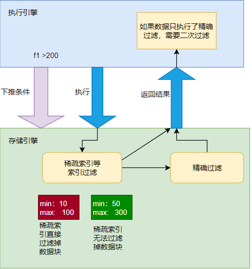 块粒度的稀疏索引过滤:支持and,or,<,>,=,>=,<=,in等运算下的常量表达式;