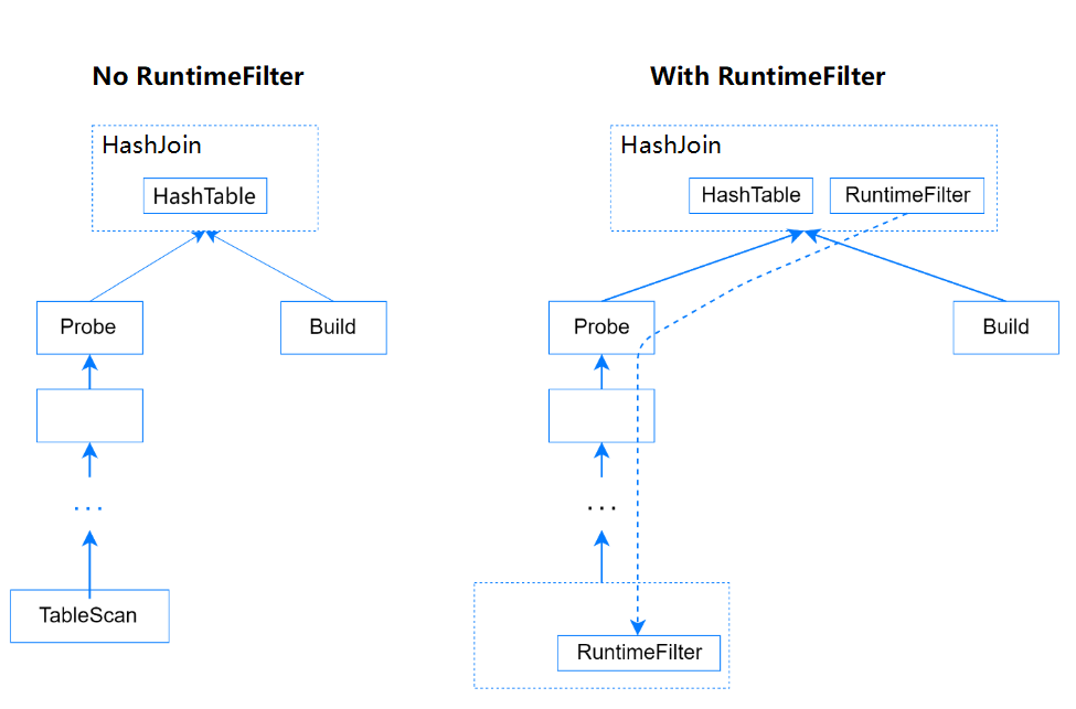 针对查询计划执行的优化技术:通过优化器、向量化执行引擎和存储引擎的紧密配合,实现将查询条件下推到存储引擎以及针对HashJoin实现运行时过滤(Runtime Filter)。