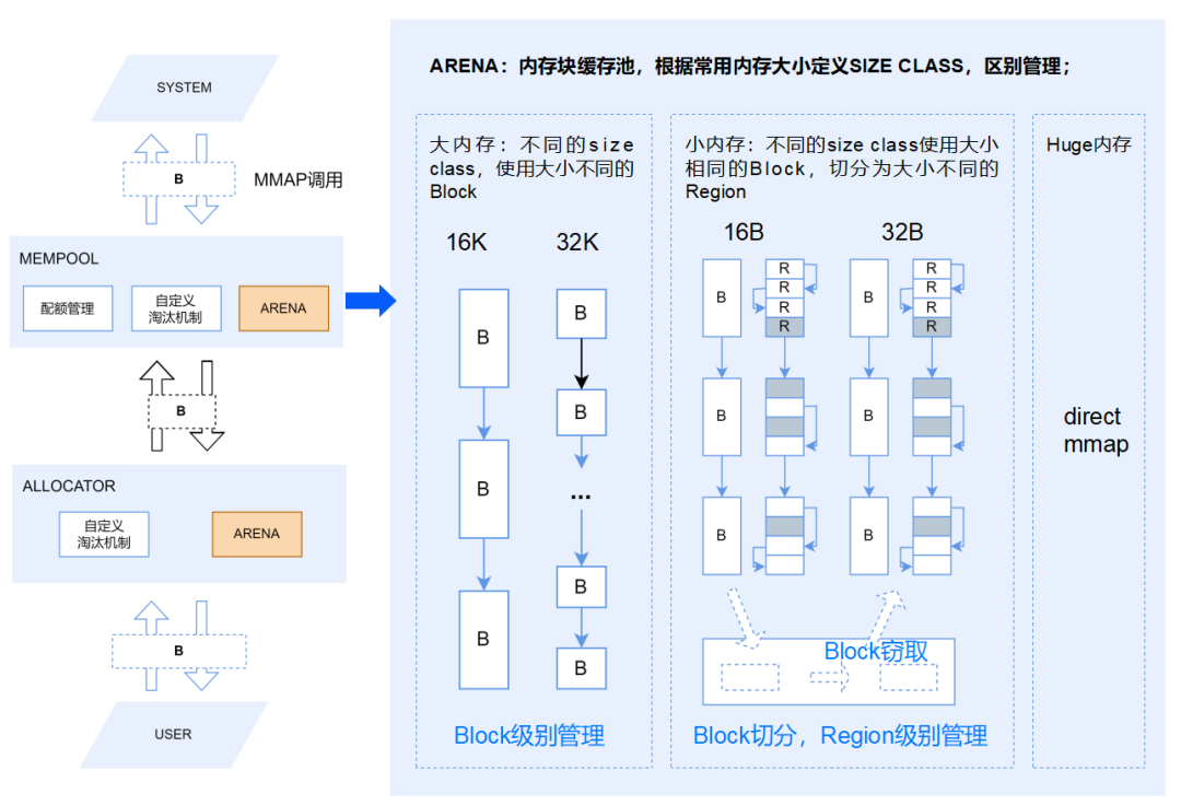 小内存:不同的SizeClass使用大小相同的Block,Block切分成大小不同的Region,进行Region级别的管理;由于不同SizeClass使用的Block大小是相同的,在某个SizeClass无空闲内存时,可以先从具有相同Block大小的SizeClass中窃取空闲内存块,都没有时,再向内存池申请;