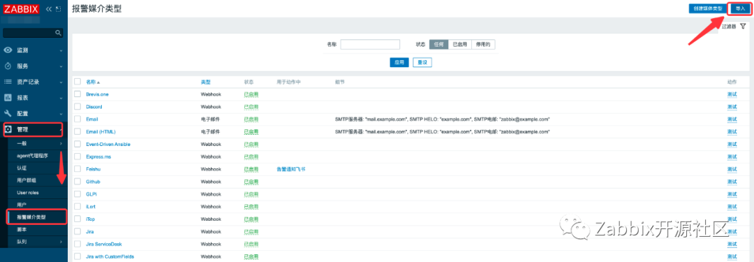 注意:zabbix 版本需要是5.0及以上 才支持导入媒介类型。