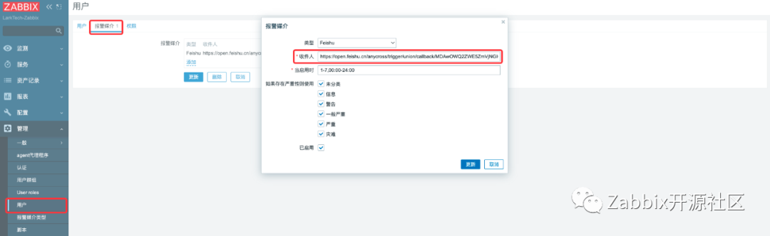 在管理 》 用户页面, 选择已有用户编辑或者新建用户页面,选择报警媒介页面,类型选择“Feishu”,收件人填入飞书的回调地址。