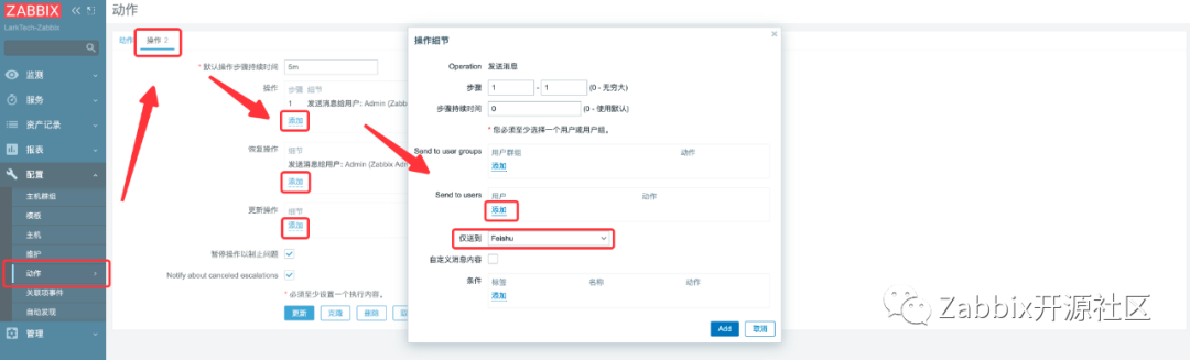 在配置 》 动作中选择需要发送给目标群的action进行修改,选择action,在操作页面添加发送对象(操作、恢复操作、更新操作都可以配置,可以按照实际情况及需求进行配置)。发送的用户选择上一步创建的用户,“仅送到” 选择飞书。