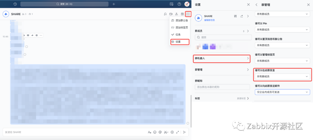 前往待发送同步信息的飞书群,添加自建机器人应用(如果还没有创建机器人,则可以完成下面的“逐步细分”后再进行此步骤操作),并在群管理设置中“谁可以在此群发言”设置为“所有群成员”(需群管理员权限)。