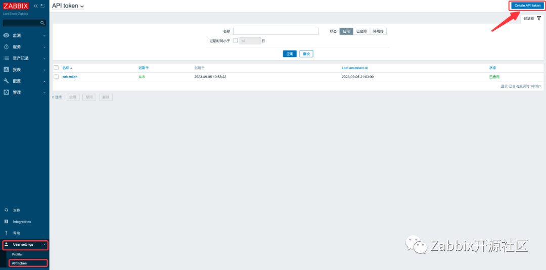 其中ApiToken是在Zabbix控制台 》用户设置》 API Token创建,如下图: