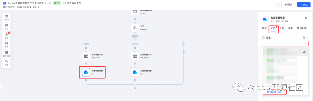 点击 发送告警信息 节点右侧的 凭证,新建/选择已有的“飞书应用授权”凭证,下文以“新建”为例: